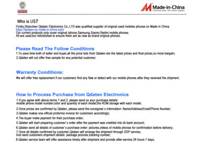 Usually, we provide a 6-month of warranty to our refurbished phones. We will not offer free after-sales service with man-made issues such as screen broken or physical damage. The buyer had better make inspection to each single phone while you sign the package. Please deliver us photos or videos about defects in time if there are any issues. Since this is a cross-border transaction, we aim to Save time and cost for seller and buyer by providing multiple after-sales solutions: